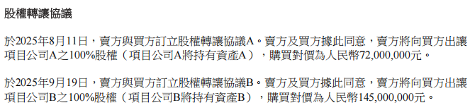 根据公告披露的股权转让协议,协议A签署于2025年8月11日,标的为资产A(1668产业园C22地块),对价7200万元人民币,要求买方在45日内完成全额支付。协议B签署于2025年9月19日,标的为资产B(精品D区项目),对价1.45亿元人民币,采用三期付款方式,最后一笔款项约定在股权变更登记前10日支付。