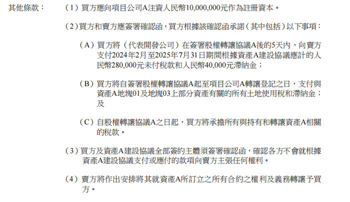 本次交易的特殊性在于,买方除支付股权对价外,还需承担多项附加责任,包括向每家项目公司注资1000万元作为注册资本,并承担自协议签署之日起与资产相关的全部税费,滞纳金及资产建设协议中的未付税款。对于资产A,买方还须支付累计28万元未付税款及4万元滞纳金。
